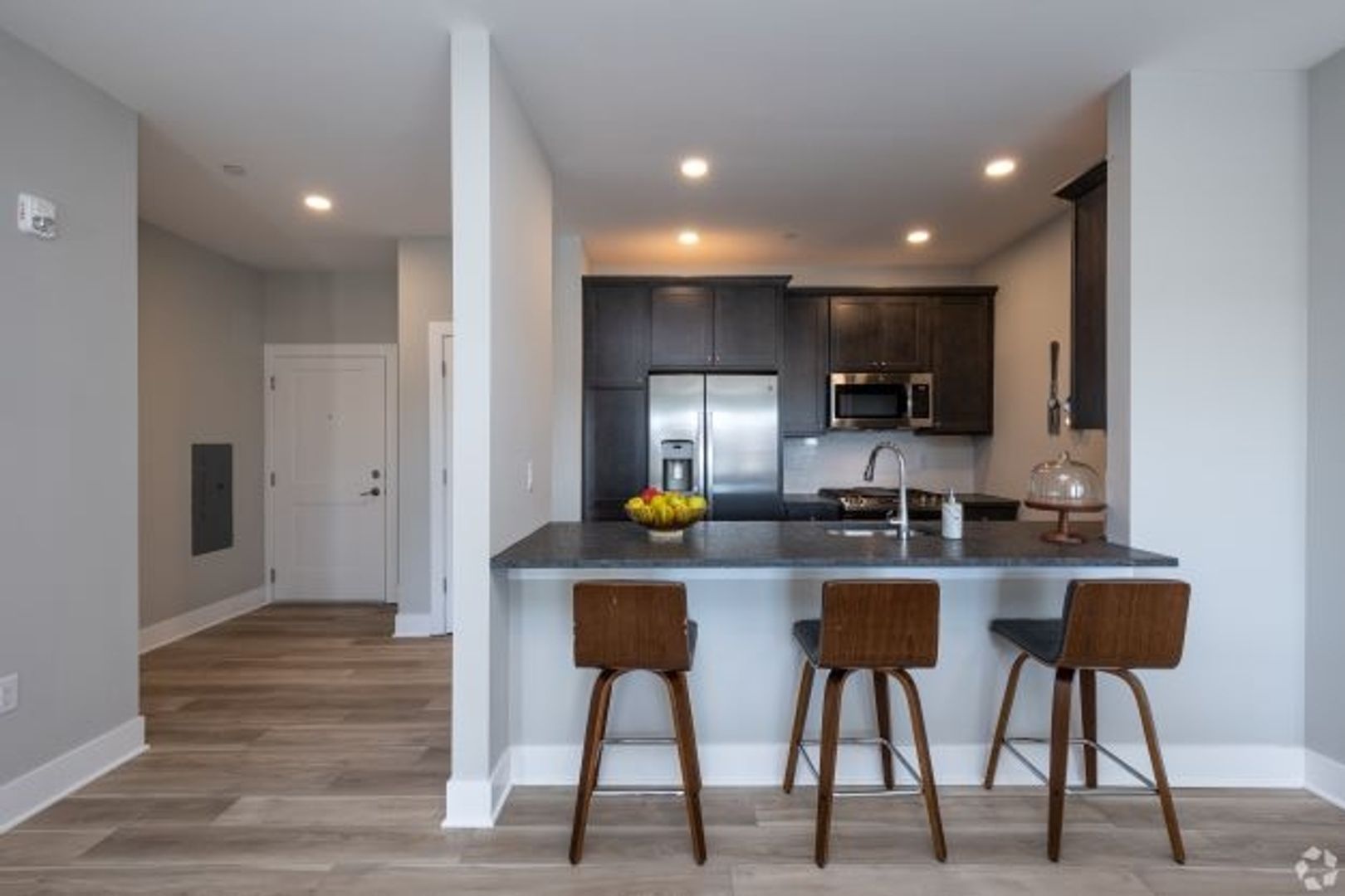 Newly constructed luxury two (2) bedroom, two (2) bath apartment includes full appliance package (GE refrigerator, D/W, gas range, microwave, washer & gas dryer); granite countertops and kitchen peninsula plus more.
