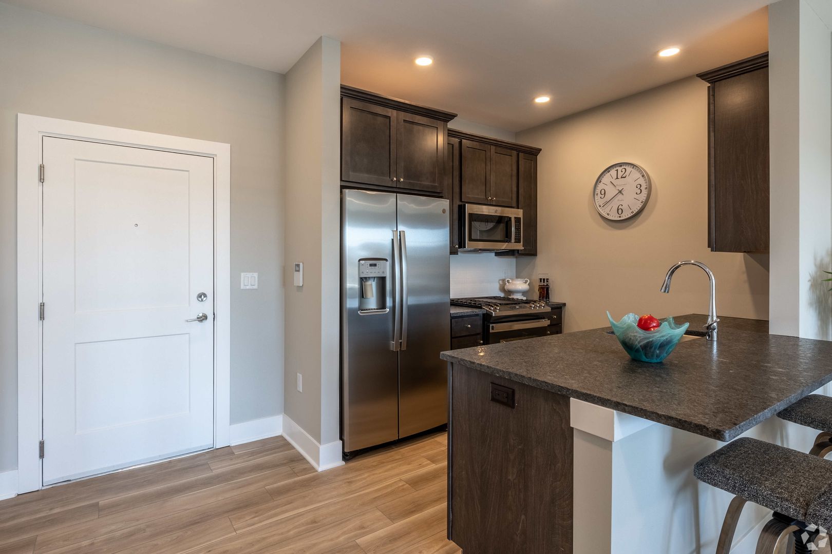 Newly constructed luxury one (1) bedroom, one (1) bath apartment includes full appliance package (GE refrigerator, D/W, gas range, microwave, washer & gas dryer); granite countertops and kitchen peninsula plus more.
